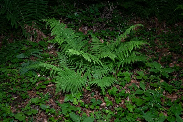 Links ein typischer schattiger Lebensraum. In der Mitte und rechts ein Wald-Frauenfarn • Athyrium filix-femina, ohne und mit sanftem Blitzlicht auf Stativ. Dadurch wird der Farn auch vom Hintergrund "freigestellt".