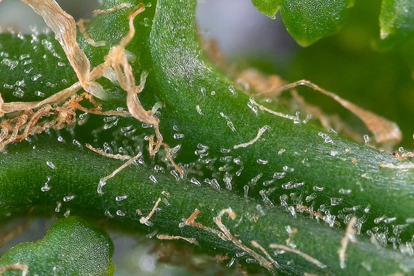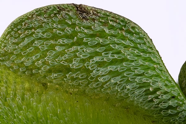 Während die Aufnahme der Keulenhaare auf dem Wald-Frauenfarn • Athyrium filix-femina (links) ein Ausschnitt aus einem einzigen Foto ist, besteht die Abbildung der Haare auf dem Lästigen Schwimmfarn • Salvinia molesta aus 14 Aufnahmen.